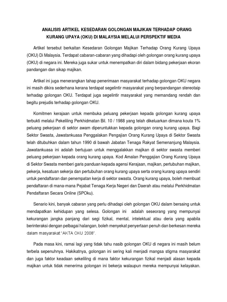 Artikel Tersebut Berkaitan Kesedaran Golongan Majikan Terhadap Orang Kurang Upaya